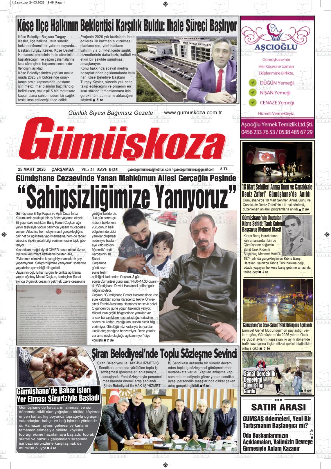 Gümüşhane Yerel Gazeteleri 25 Mart 2026, Çarşamba Günü Manşeti