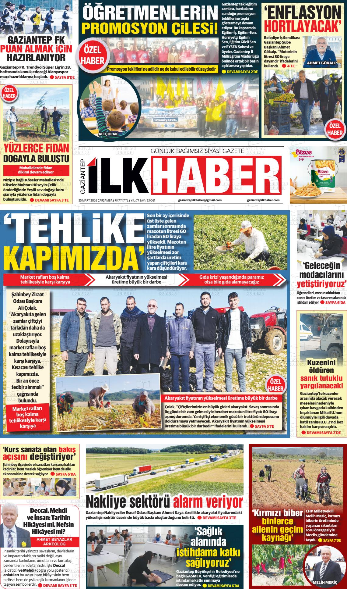 Gazİantep Yerel Gazeteleri 25 Mart 2026, Çarşamba Günü Manşeti